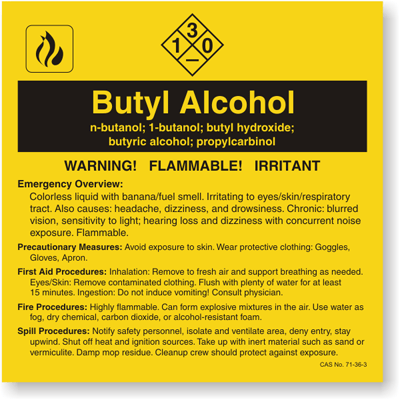 A Butyl Alcohol chemical label will help prevent an avoidable and unnecessary accident. Nothing works better to increase safety than a Butyl Alcohol label.