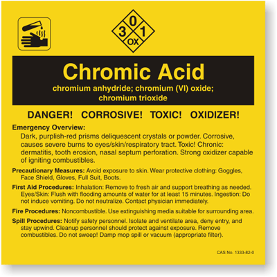 A Chromic Acid chemical label will help prevent an avoidable and unnecessary accident. Nothing works better to increase safety than a Chromic Acid label.