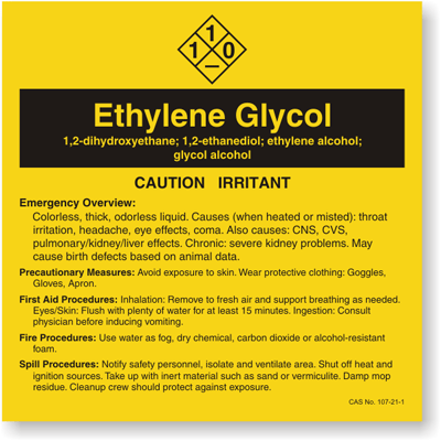 A Ethylene Glycol chemical label will help prevent an avoidable and unnecessary accident. Nothing works better to increase safety than a Ethylene Glycol label.