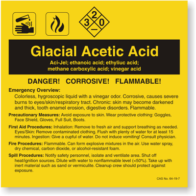 A Glacial Acetic Acid chemical label will help prevent an avoidable and unnecessary accident. Nothing works better to increase safety than a Glacial Acetic Acid label.