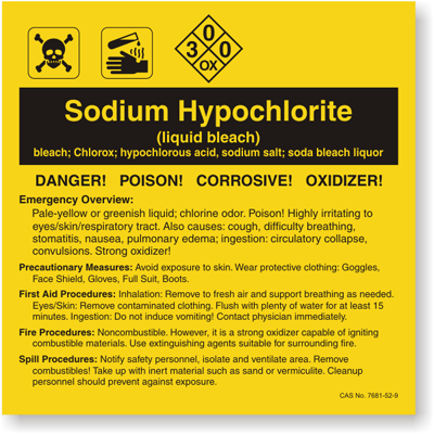 A Sodium Hypochlorite (liquid Bleach) chemical label will help prevent an avoidable and unnecessary accident. Nothing works better to increase safety than a Sodium Hypochlorite (liquid Bleach) label.