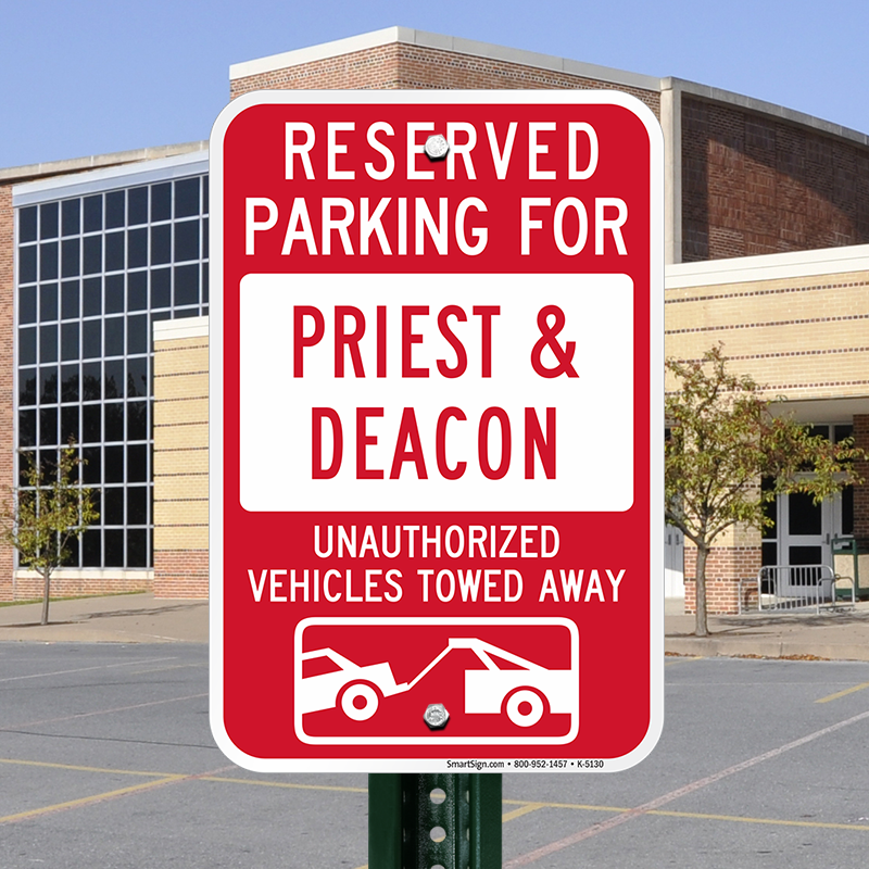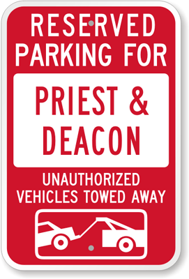Tow Away Sign: Reserved Parking For Priest & Deacon : Unauthorized Vehicles Towed Away K-5130 Learn More...