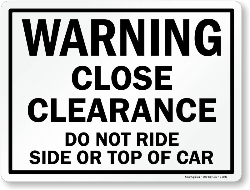 Trains passing don't leave much clearance, so warn people not to ride on the stop or sides of the car.