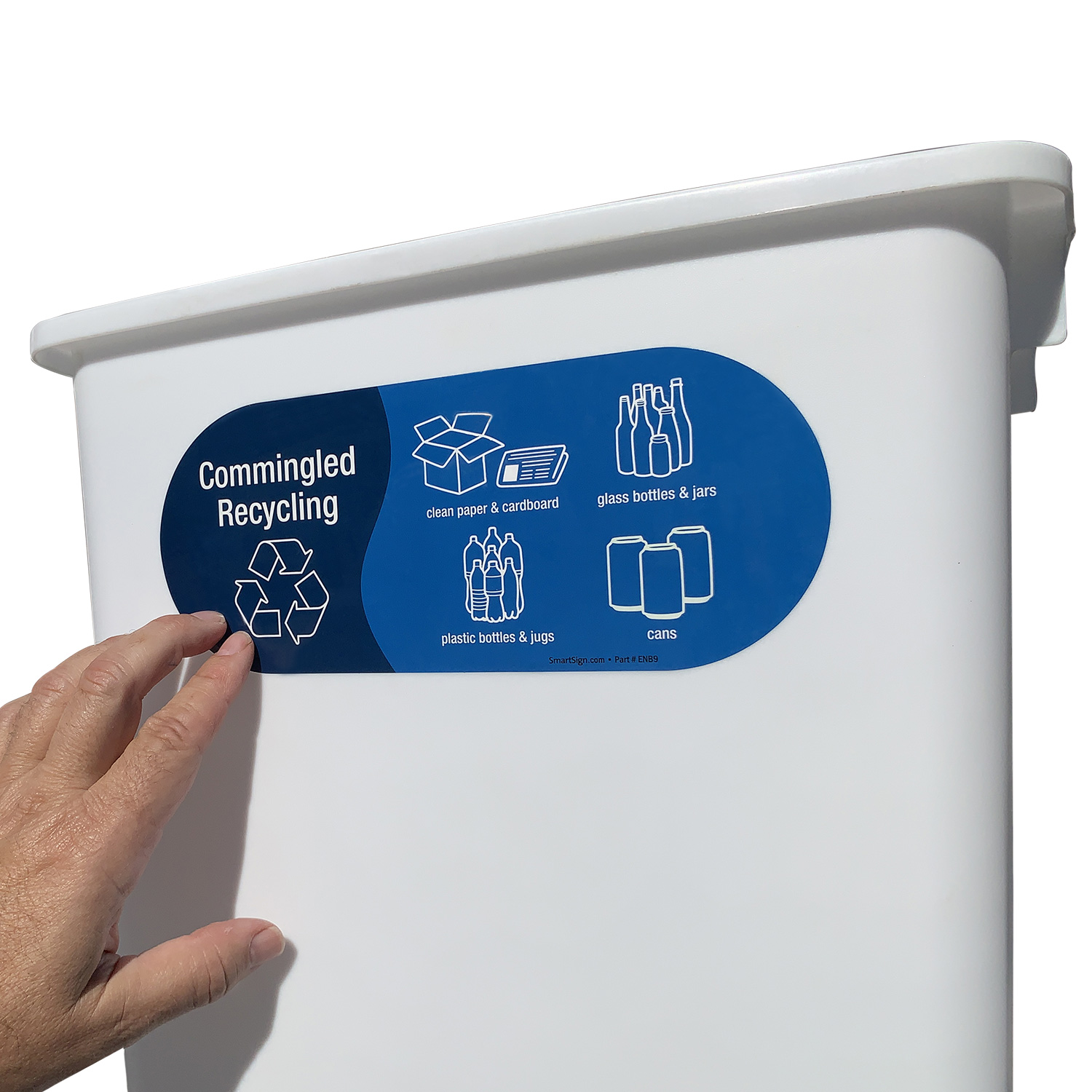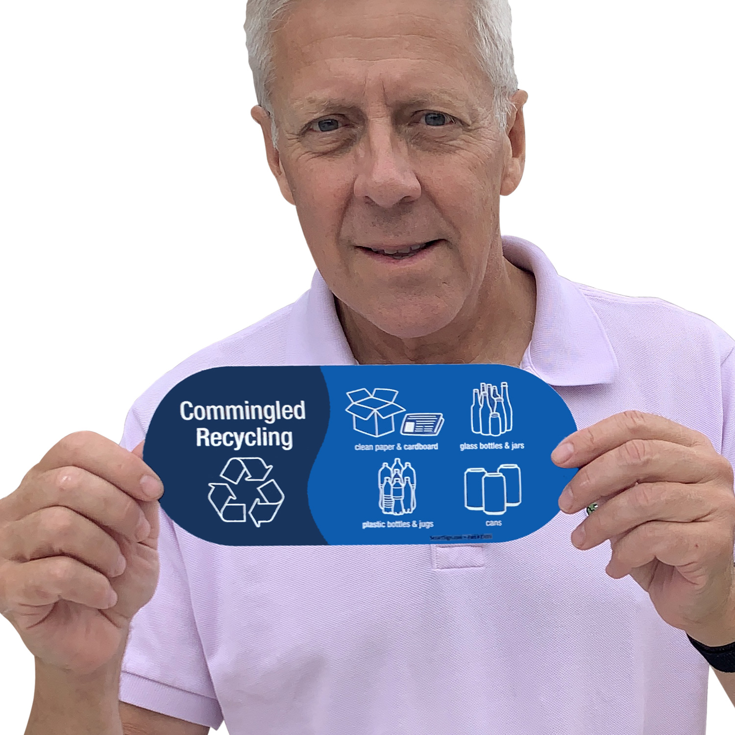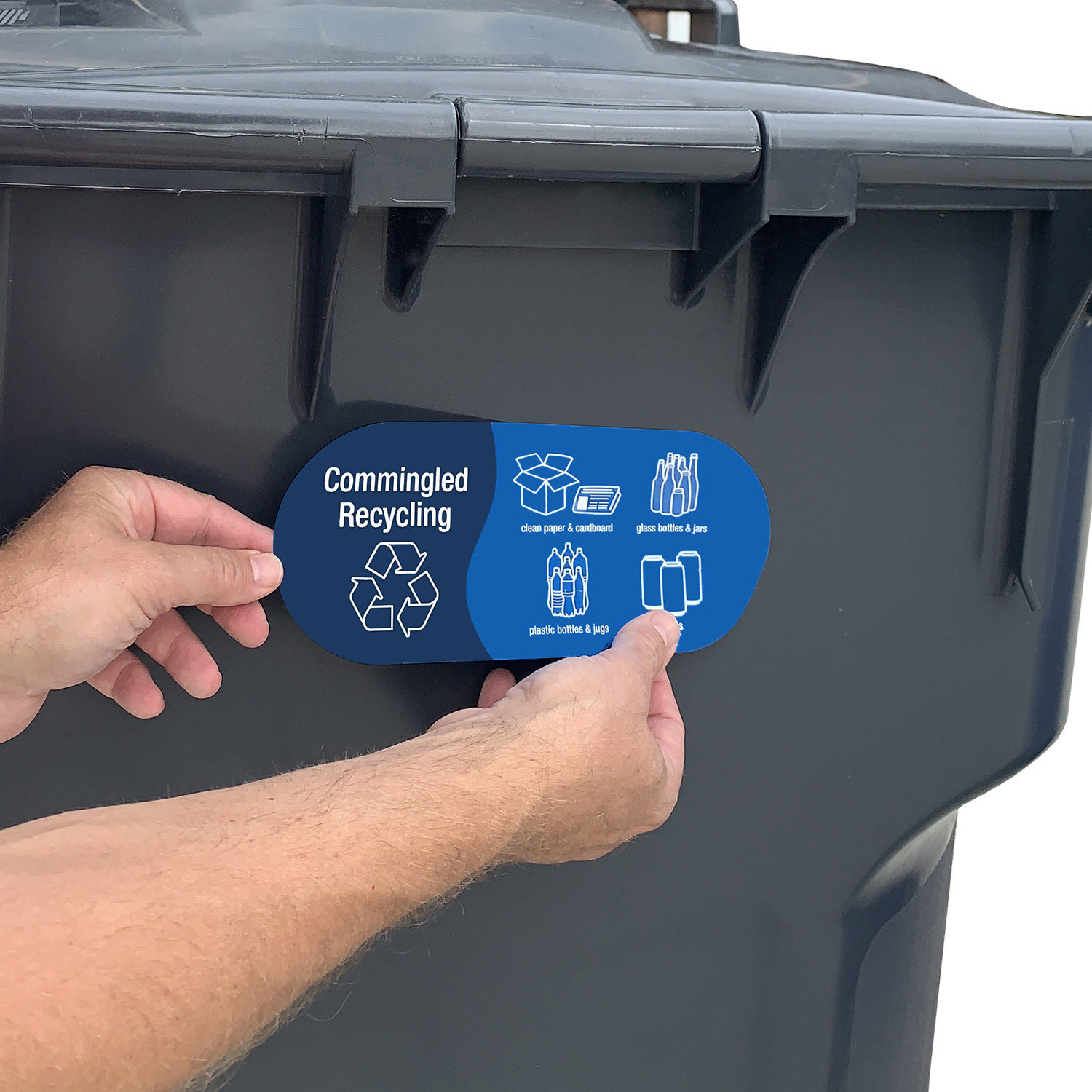 Vinyl stickers for commingled recycling containers are difficult to take off or tear apart. Apply this colored label to get everybody's attention focused on recycling.