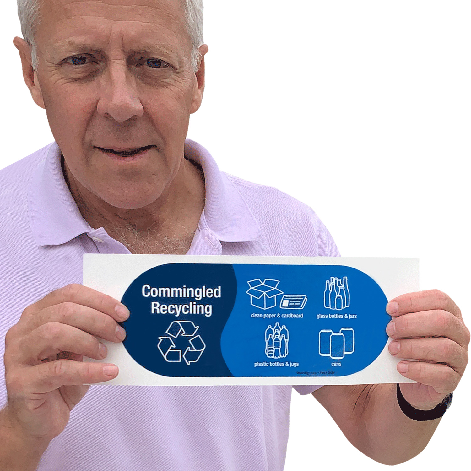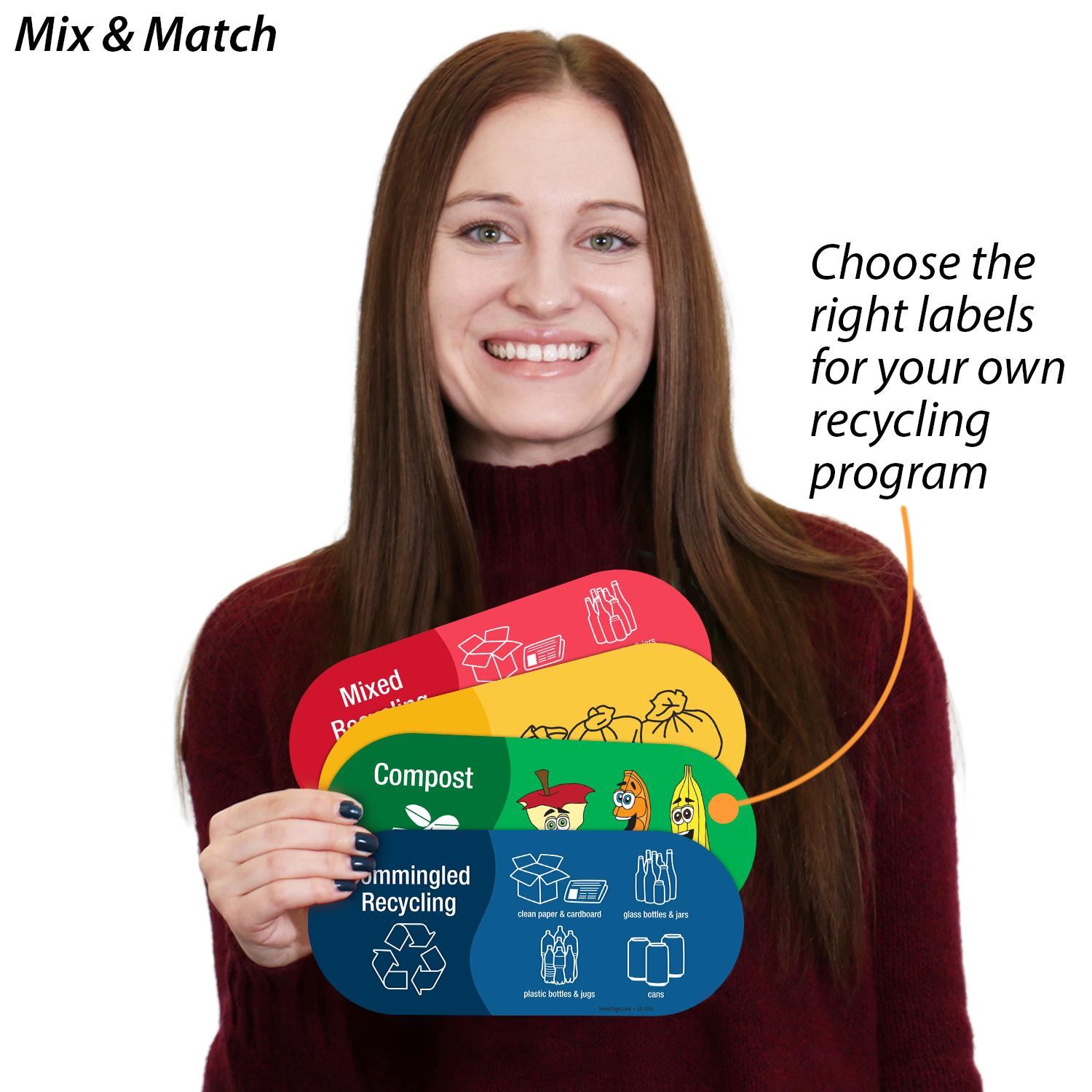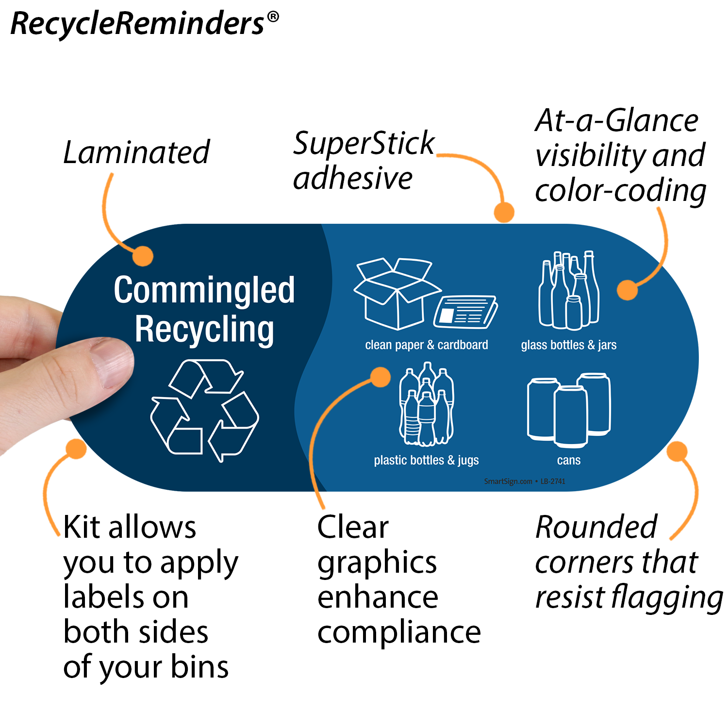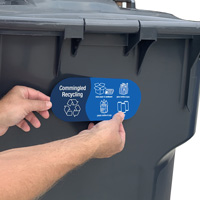 Vinyl stickers for commingled recycling containers are difficult to take off or tear apart. Apply this colored label to get everybody's attention focused on recycling.