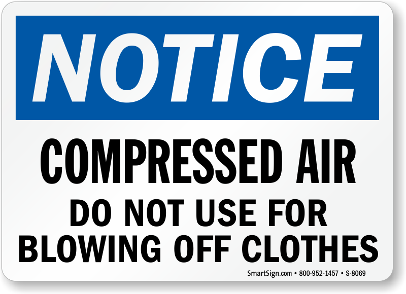 Many workers have the habit of cleaning dirt off their clothes with easily available compressed air at the workplace. With this OSHA Notice Sign, strictly tell them it is not allowed.