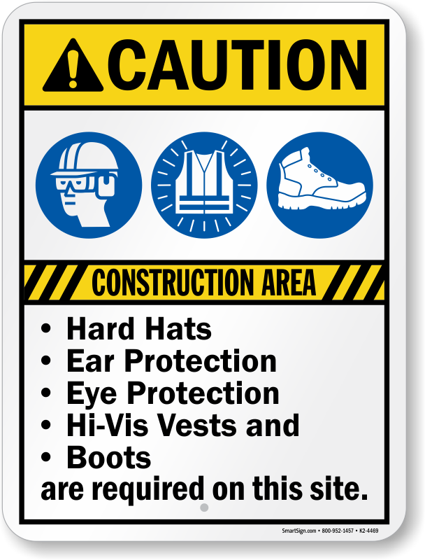 ANSI Caution Sign: Construction Area - Hard Hats, Ear Protection, Eye Protection, HI-VIS Vests And Boots Are Required On This Site Learn More...