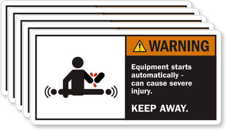 2.5in. x 5in. Laminated Vinyl Labels: Warning - Equipment Starts Automatically - Can Cause Severe Injury L-0164-VS