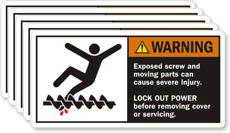 2.5in. x 5in. Laminated Vinyl Labels: Warning - Exposed Screws And Moving Parts Can Cause Severe Injury L-0163-VS