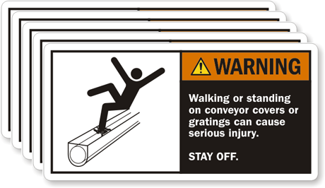 2.5in. x 5in. Laminated Vinyl Labels: Warning - Walking Or Standing On Conveyor Covers Or Gratings Can Cause L-0169-VS