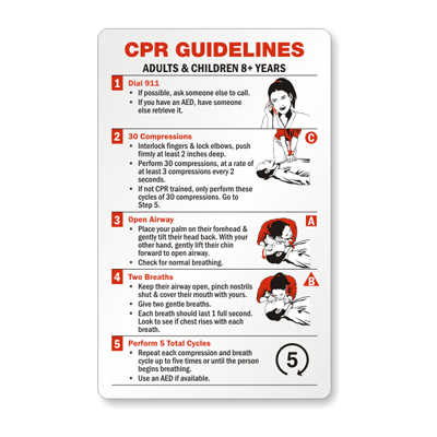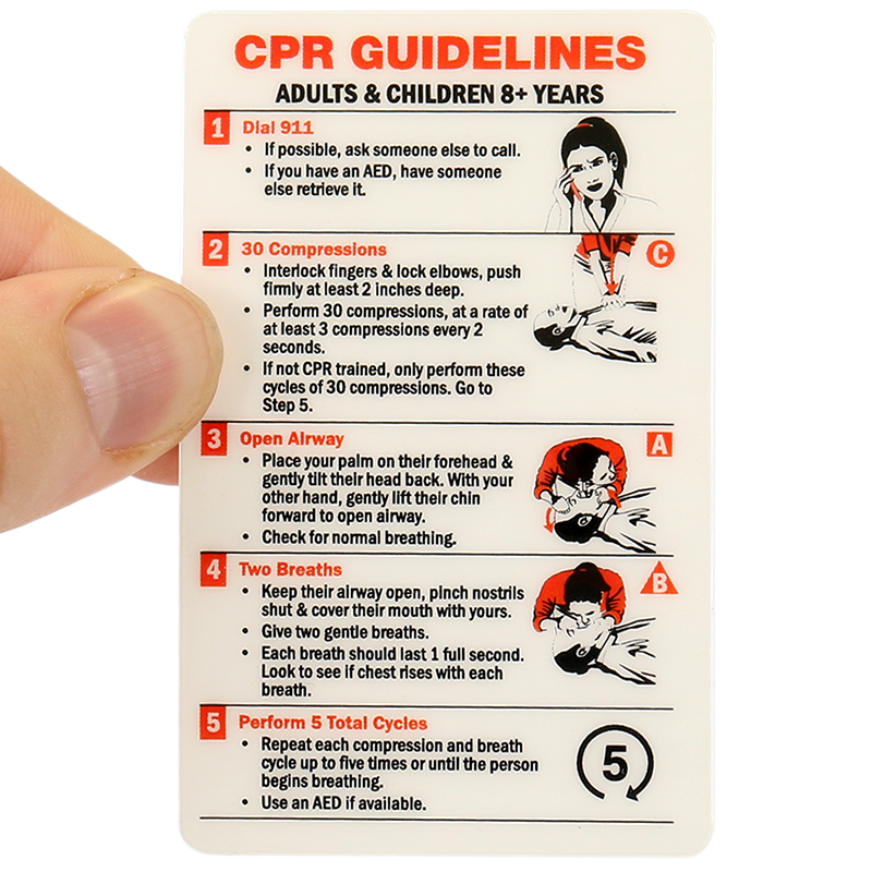 CPR Guidelines Wallet Card can be issued to employees in your workplace to aid staff and visitors during an emergency. Card includes clear step-by-step process of performing CPR on adults and children (8+ years).