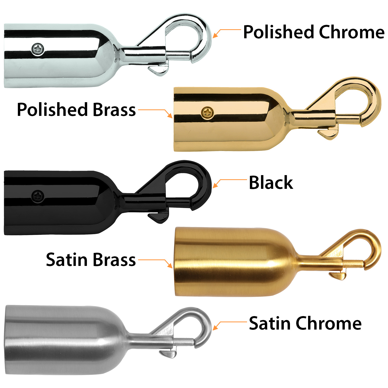 Ropes feature snap hooks with 5 finishes to choose from.