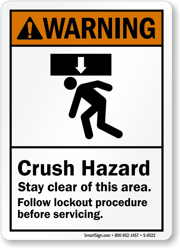 Areas that have body crush hazards from above should be demarcated using this ANSI sign. Make sure workers stay clear of the area and lockout procedure is followed before servicing.