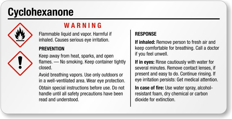 With our tiny GHS Chemical Label, inform employees that Cyclohexanone is flammable and harmful if inhaled.