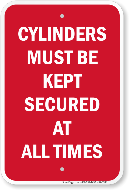 Gas Cylinder Sign: Cylinders Must Be Kept Secured At All Times Learn More...