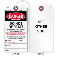 2-Sided OSHA Danger Safety Tag: Tear-Off Do Not Operate, Move Or Use While This Tag With Fiber Patch T390