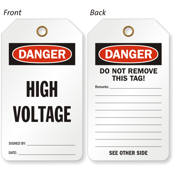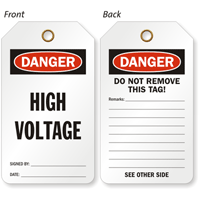 Inform workers and visitors of high voltage devices, panels and, machinery with this OSHA 2-Sided Electrical Tag.