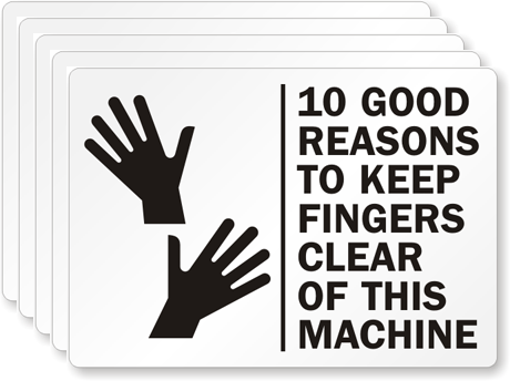 3.5in. x 5in. Laminated Vinyl Labels (Pack Of 5): 10 Good Reasons To Keep Fingers Clear Of This Machine L-0142-VS