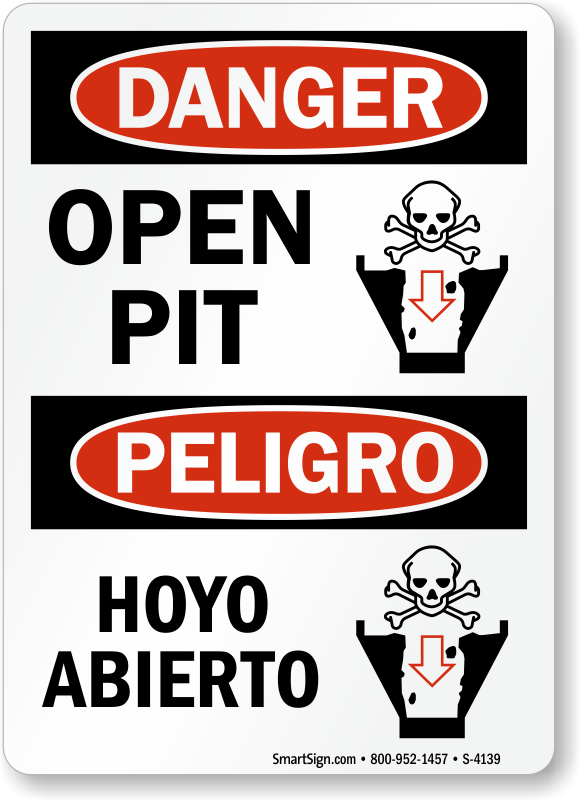 Warn unauthorized people to keep away from open pit with this Bilingual OSHA Danger sign. Clear self-explanatory graphics and text in both English and Spanish caters to a wider audience.