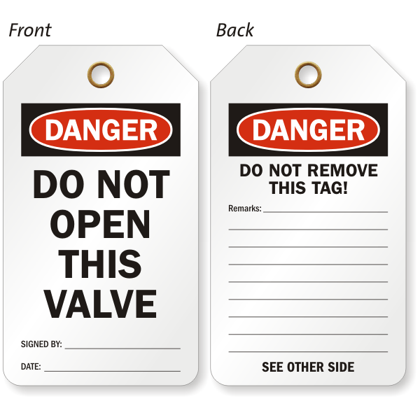 Use this 2-Sided OSHA Danger Safety Tag to mark a closed valve so that no worker mistakenly opens the valve.