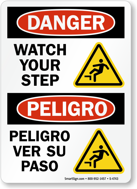 Alert people to watch their steps while they walk. Use this OSHA Danger sign with bilingual message and save people from tripping on the floor.