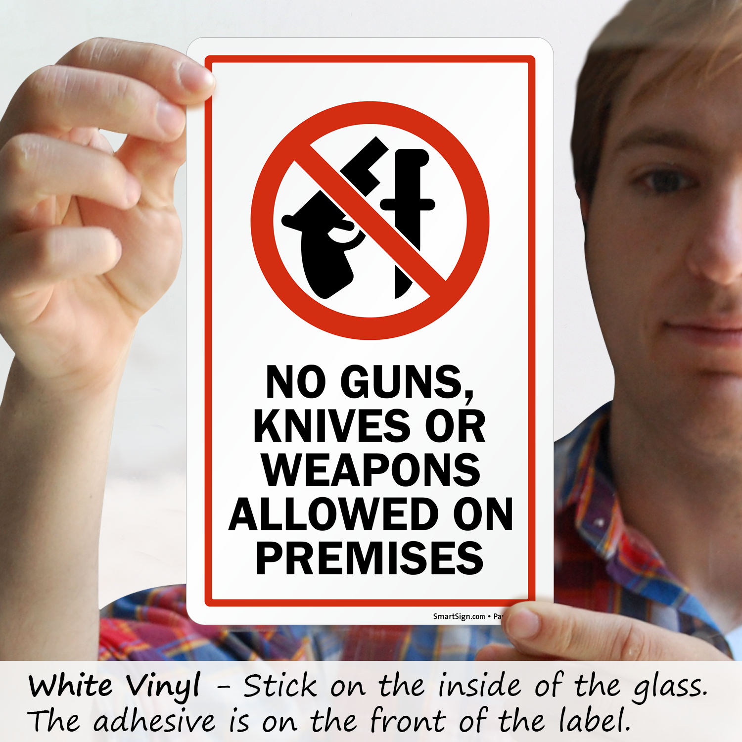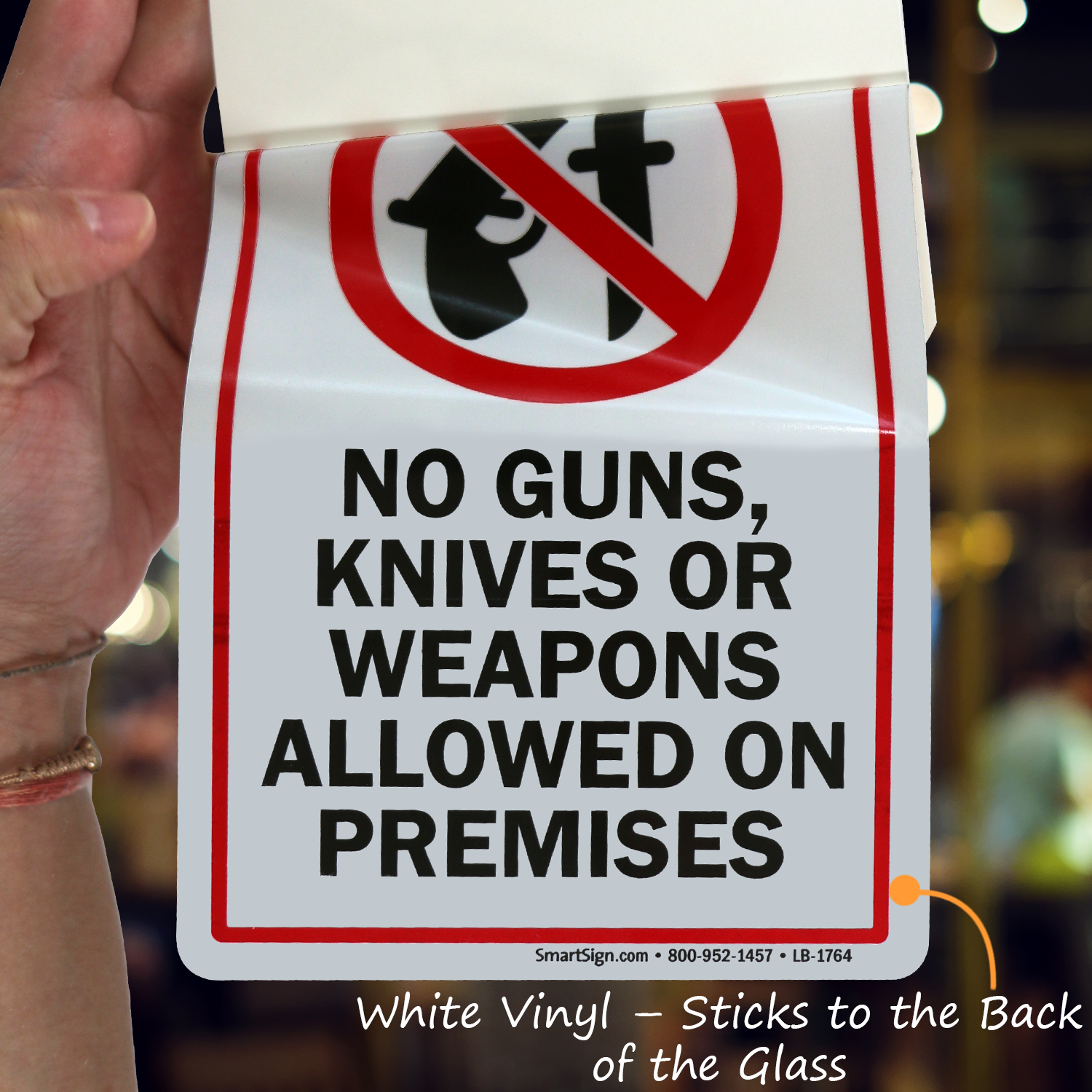 No Guns, Knives or Weapons Allowed” window decal with bold text and symbol. Durable, fade-resistant vinyl for retail stores and offices.
