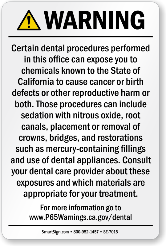 - California requires a warning sign for delivery of dental care and use of dental appliances to be posted at all public points of entry to the dental office or within the office where exposure occurs.