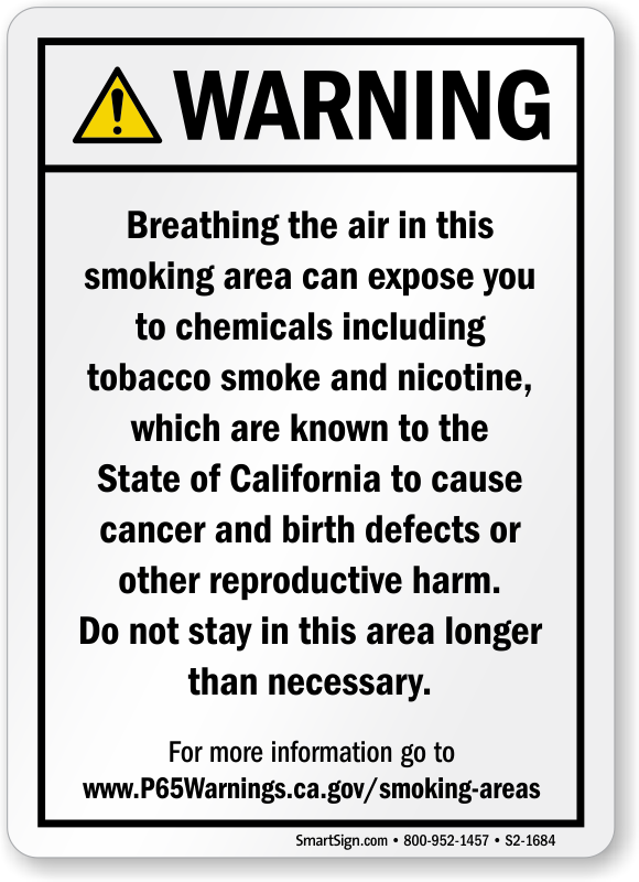 California Prop 65 Sign: Warning - Breathing The Air In This Smoking Area Can Expose You To Chemicals Including Tobacco Smoke And Nicotine Learn More...