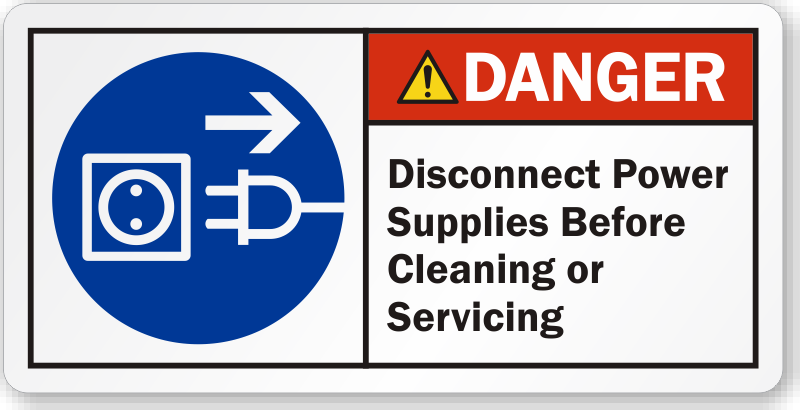 Keep your workers safe with this ANSI regulated sign. Instruct people to disconnect power supplies before cleaning or servicing machinery.