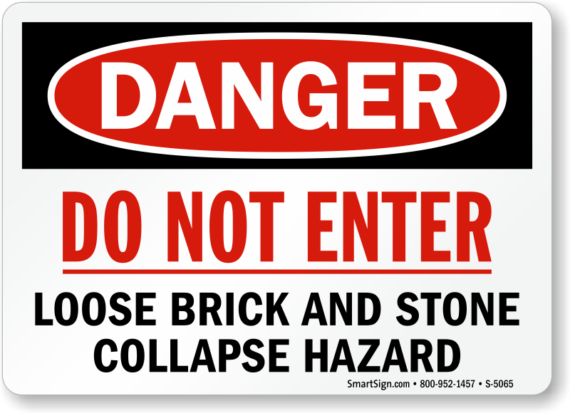 Keep people away from the area of loose brick and stone collapse hazard by installing this OSHA Danger sign in the vicinity. Bold red "Do Not Enter" text is underlined to effectively communicate your message.