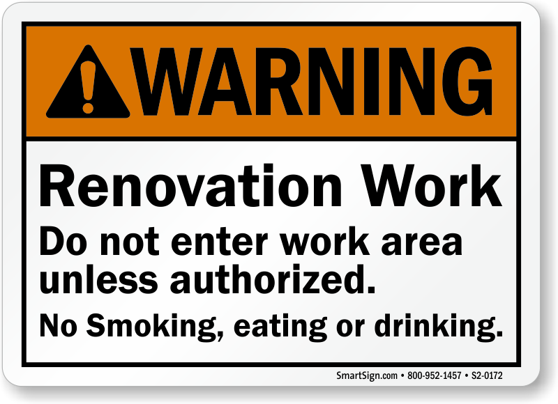 An ANSI Warning Sign makes sure no unauthorized individual enters, smokes, eats, or drinks in the renovation zone.