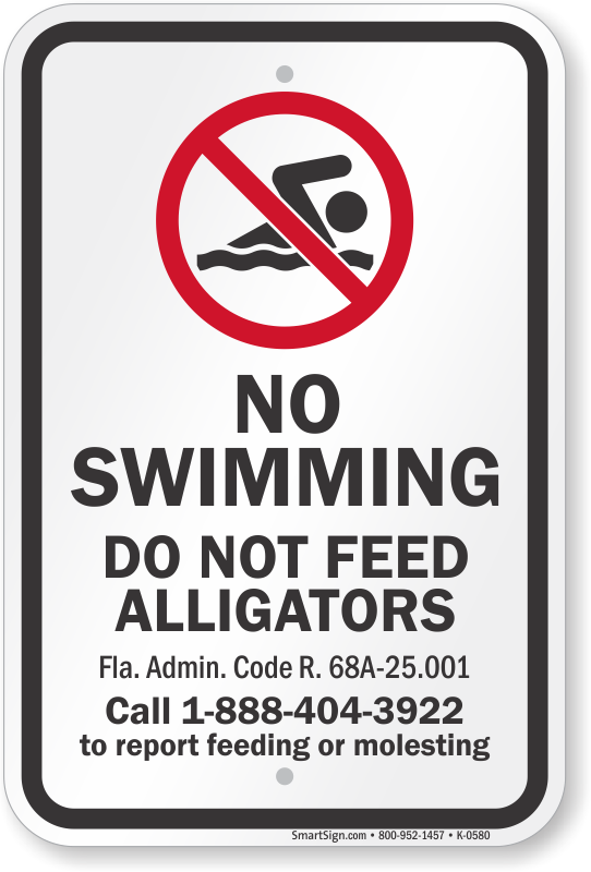 Florida Alligator Warning Sign: No Swimming - Do Not Feed Alligators FLA. Admin. Code R. 68A-25.001 Call 1-888-404-3922 To Report Feeding Or Molesting K-0580 Learn More...