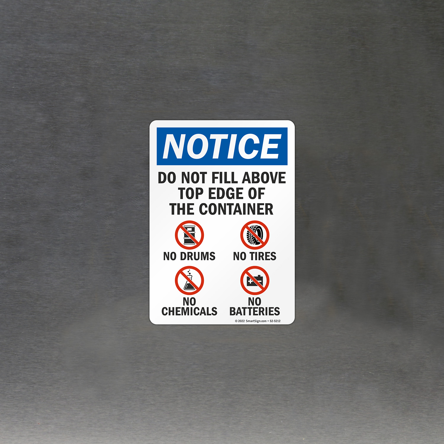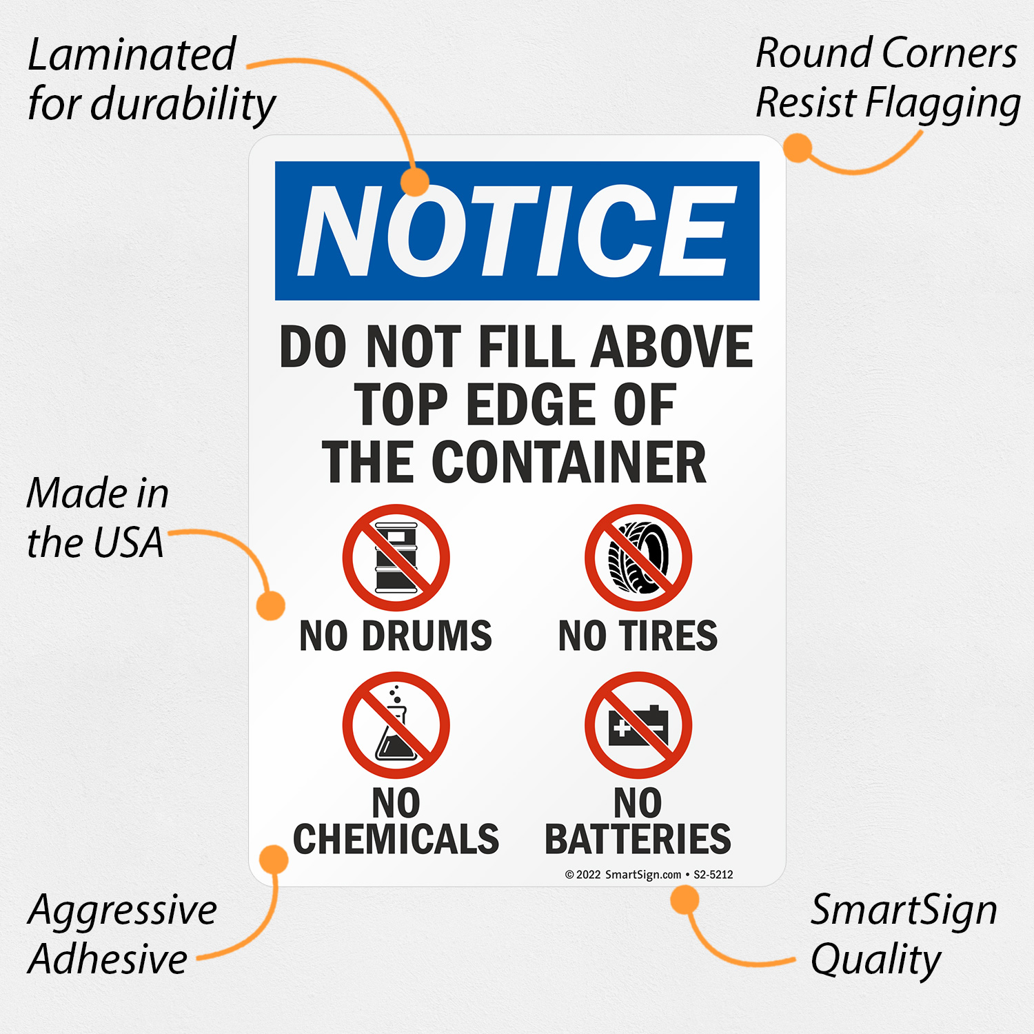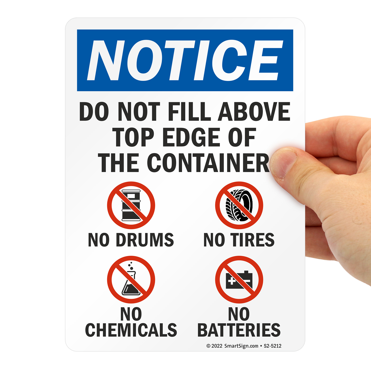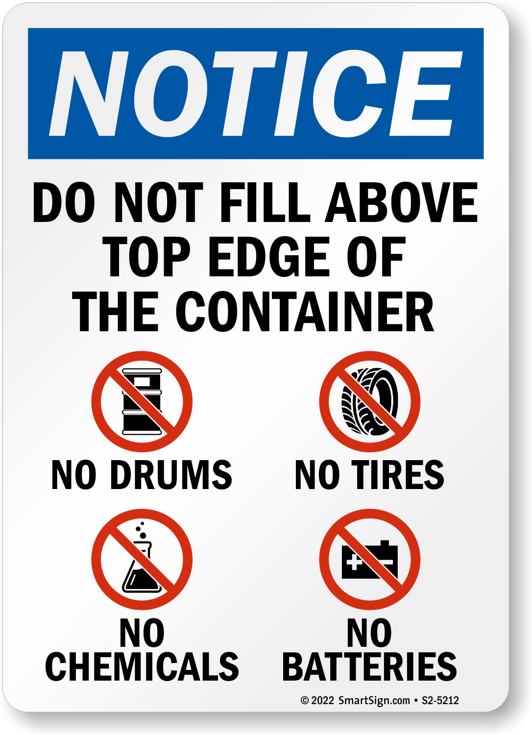 OSHA Notice Sign: Do Not Fill Above Top Edge Of The Container - No Drums, No Tires, No Chemicals, No Batteries S2-5212