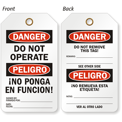 Two-Sided Bilingual OSHA Safety Tag is great for cautioning both English and Spanish speaking workforce in your facility.