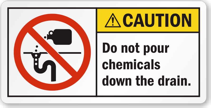 Clearly tell employees to not pour chemicals in the drain. Apply this label which has a symbol to add volume to the message.