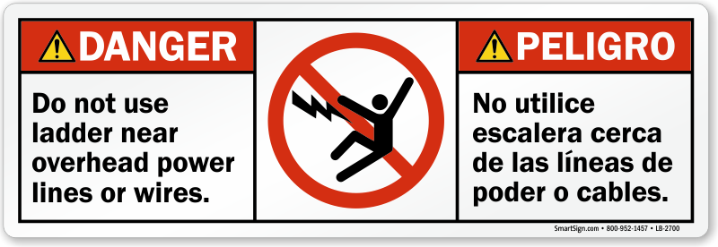 Prevent workers from using the ladder near overhead power lines or wires. This Bilingual ANSI Danger/Peligro Ladder safety label with an electrocution symbol will caution everyone against the danger.