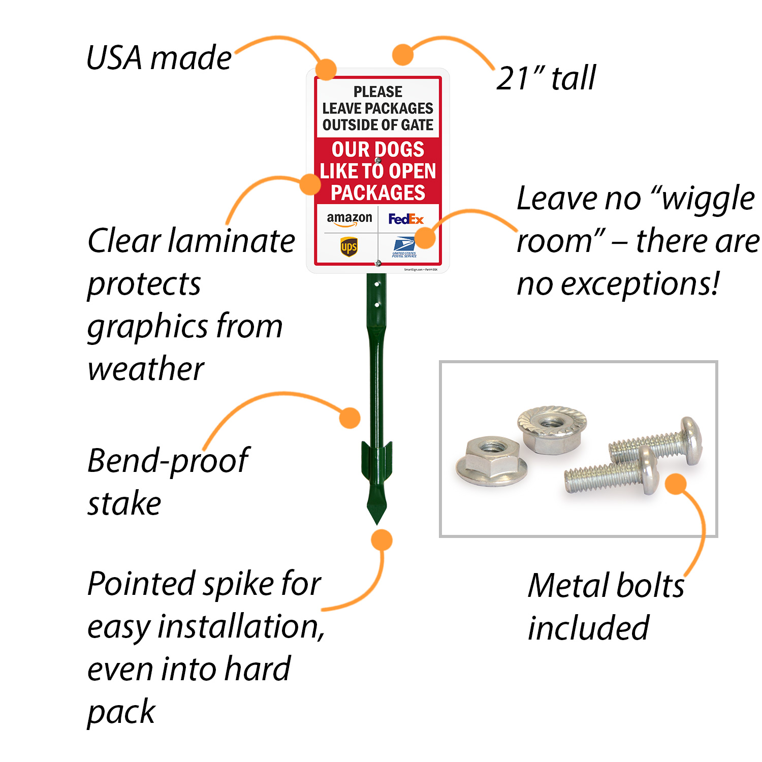 40 mils thick aluminum sign with a 18” stake. Finished kit is 21.5” tall.