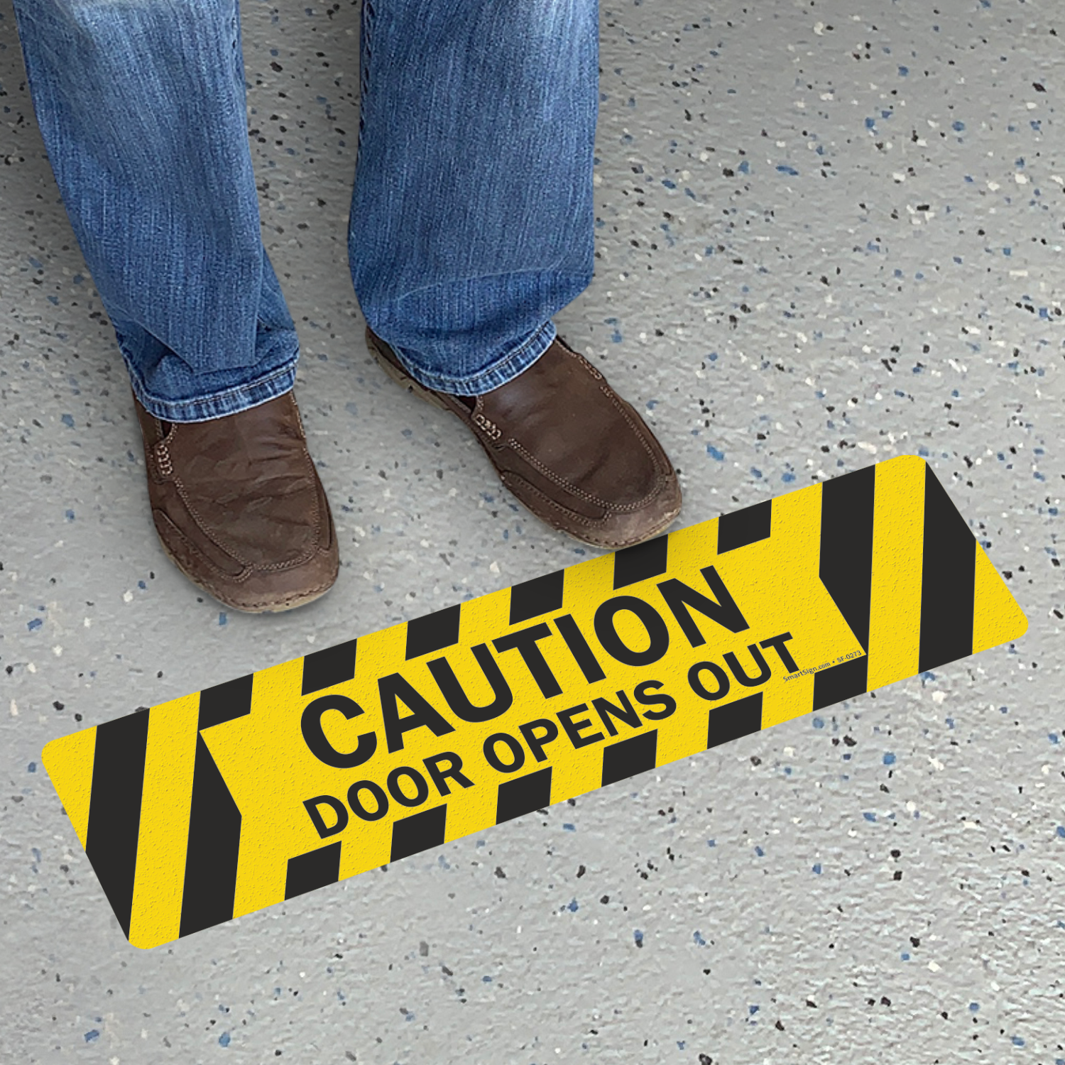 - Floor sign provides a high-visibility reminder at entrances.
