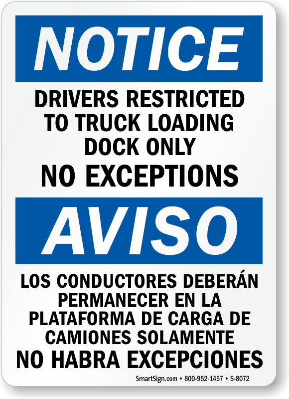 A Bilingual OSHA Notice Sign is effective in reminding English and Spanish speaking drivers that they are restricted to the loading dock only.