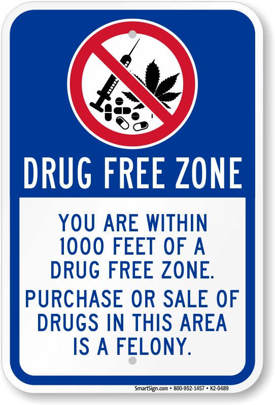 Drug Free Area Sign: Drug Free Zone - Within 1000 feet Of Drug Free Zone, Purchase Or Sale Of Drugs In Area Is Felony K2-0489 Learn More...