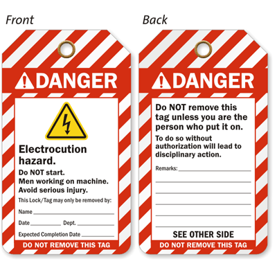Affix this Electrocution Hazard ANSI Tag on your equipment or machinery while maintenance work in under process. This tag will inform everyone men are working on the machine.