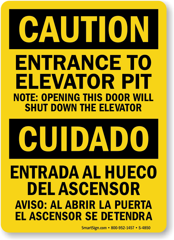 Make elevator safety a priority by using a "entrance to elevator pit note opening this door will shut down elevator (bilingual)" sign.