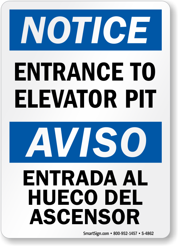 Bilingual OSHA Notice / Aviso Sign: Entrance to Elevator Pit / Entrada Al Hueco Del Ascensor