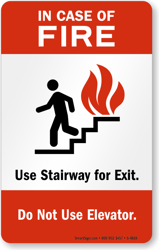 Don’t let elevators be a source of injury. Use a "in case of fire (stair symbol)" sign.