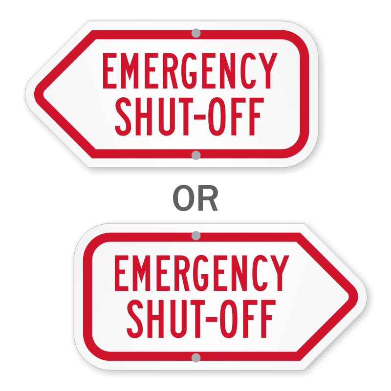 These left and right pointing Emergency Shut-Off Signs help you show way to the valve, switch, or button from where a supply can be shut off completely. Weather-proof and resilient against abuse, these directional signs are built to last for years.