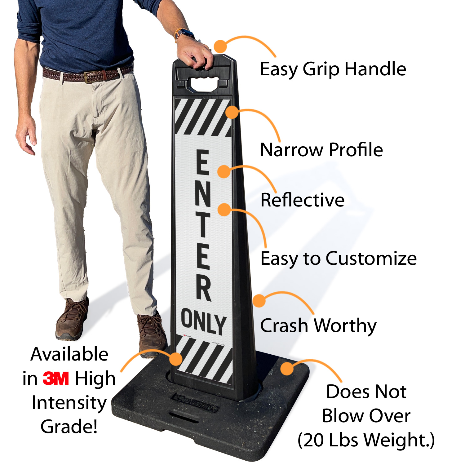 Sign panel and base are stackable for compact storage.