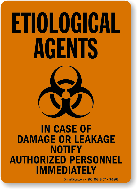 Etiological agents can cause biohazards. Inform workers of the same by installing this sign and ask them to inform authorized personnel if the container leaks or is damaged.