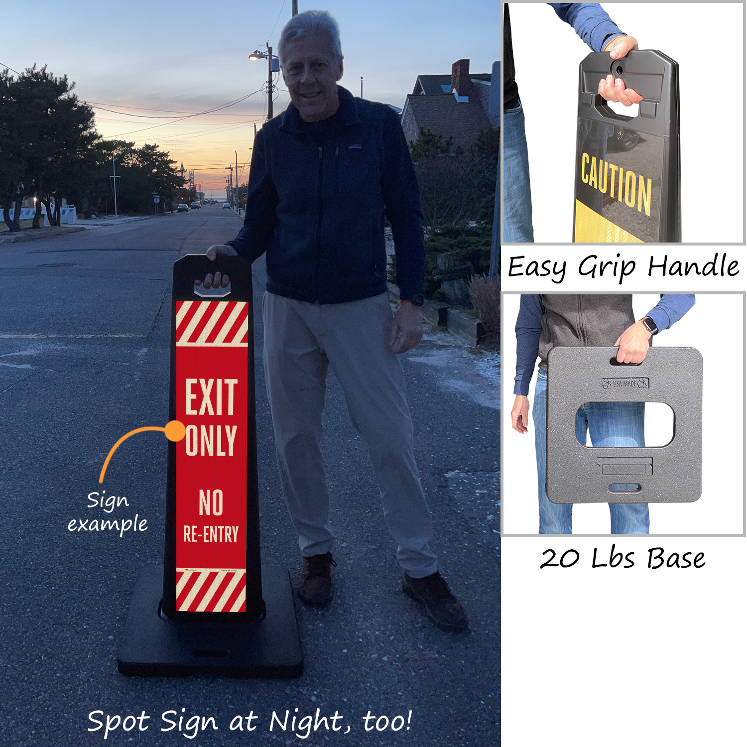 Sign panel and base are stackable for compact storage.
