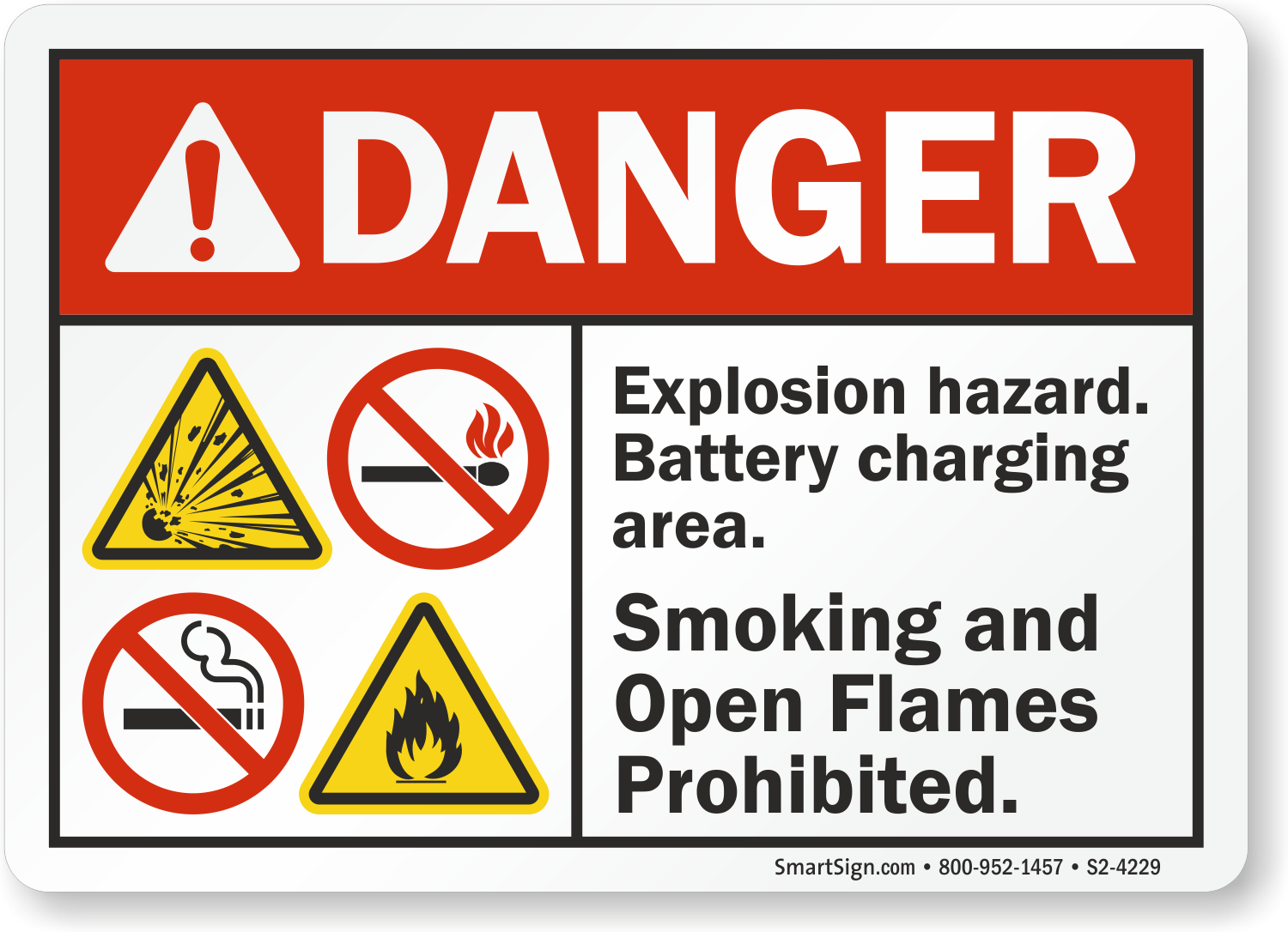 Smoking or open flames can result in a fire or explosion in battery charging area. ANSI Danger Sign conveys your safety message effectively.