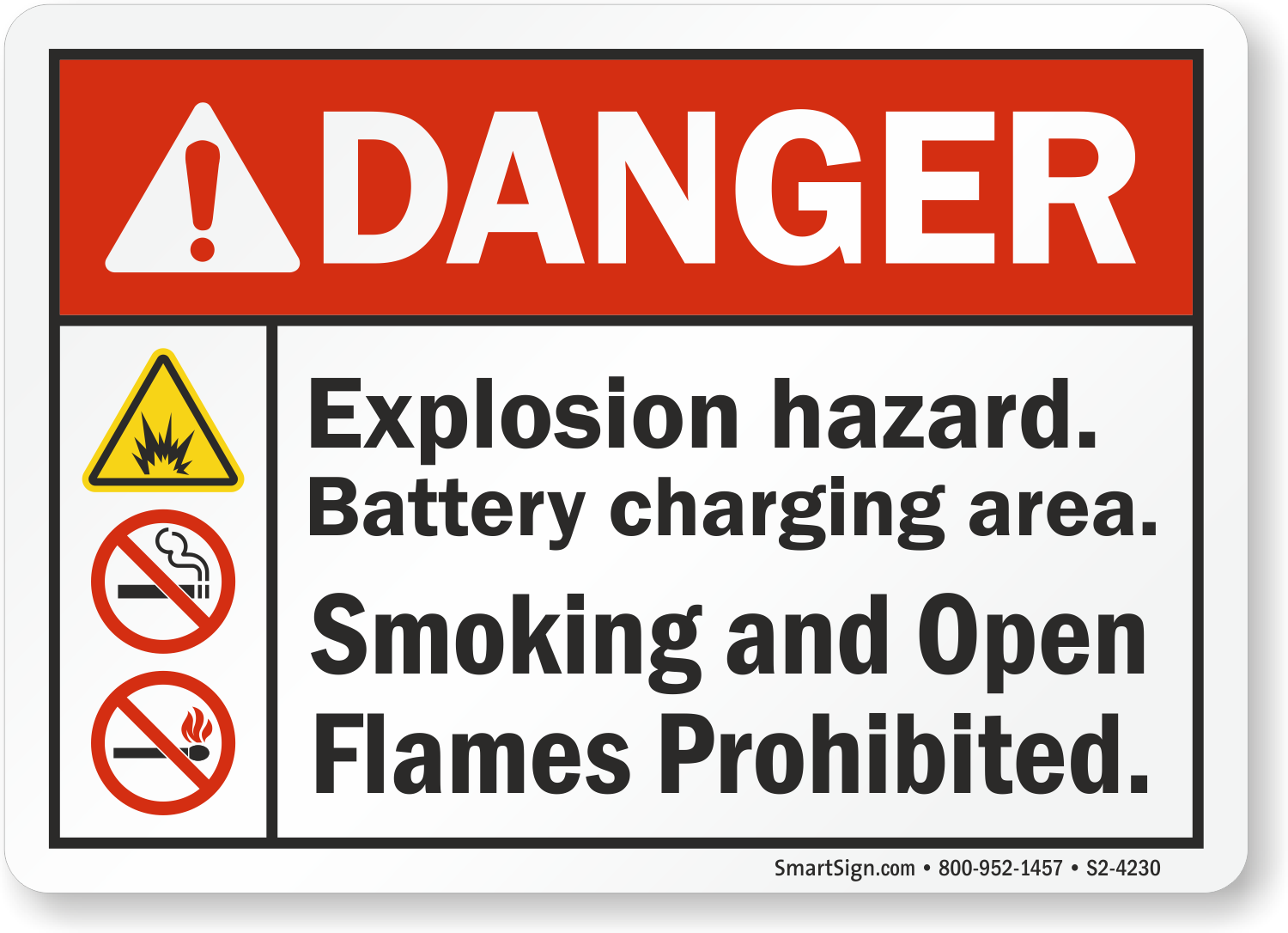 Smoking or open flames can lead to a fire or explosion in battery charging area. ANSI Danger Sign conveys your safety message effectively.